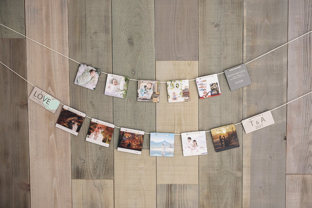 複数の写真を紐でつないだインテリアアイテム。リビングや子ども部屋に飾って楽しんでください